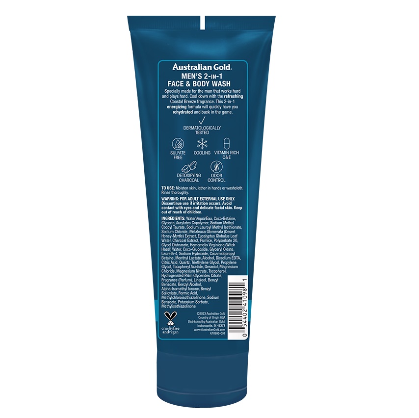 Η Australian Gold Men's συλλογή δημιουργήθηκε για τον άνθρωπο που εργάζεται σκληρά και διασκεδάζει έντονα. Φτιαγμένη με ήπια, ποιοτικά συστατικά που βελτιώνουν την υγεία και την όψη του δέρματος. Η φόρμουλά της περιλαμβάνει αποτοξινωτικό ενεργό άνθρακα, συστατικά που καταπολεμούν τις οσμές και είναι πλούσια σε βιταμίνες, ώστε να αισθάνεστε το δέρμα σας φρέσκο και καθαρό όλη μέρα