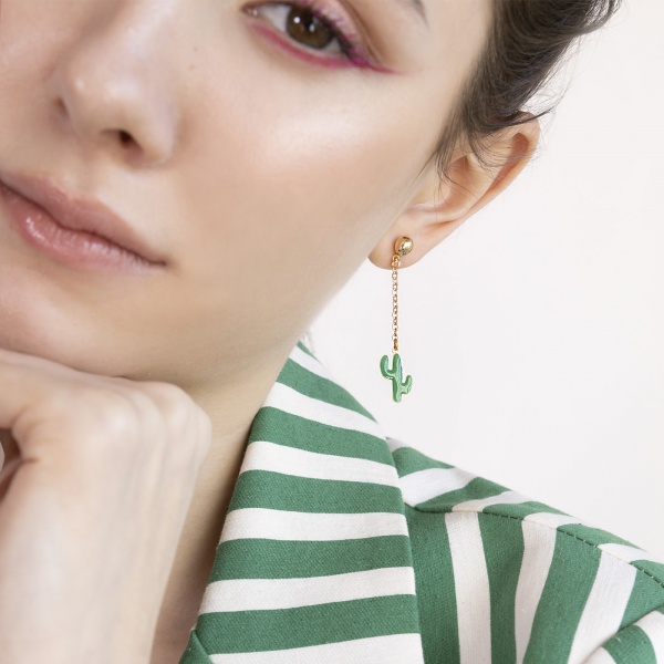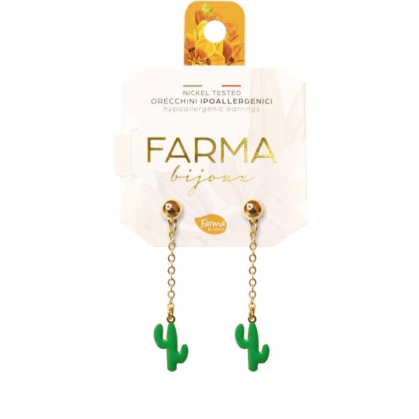 Υποαλλεργικά σκουλαρίκια κρεμαστοί κάκτοι σε επιχρυσωμένη αλυσίδα 50mm της συλλογής Summer Collection από τη Farma Bijoux. Δημιουργήθηκαν με σεβασμό στο περιβάλλον και την επιδερμίδα. Τα σκουλαρίκια της Farma Bijoux κατασκευάζονται στην Ιταλία ενώ συσκευάζονται με πιστοποιημένο χαρτί FSC. Η ποιότητα η ομορφιά και η ασφάλεια είναι οι λέξεις κλειδιά που προσδιορίζουν την φιλοσοφία της Farma Bijoux! 100% Κατασκευασμένα στην Ιταλία.