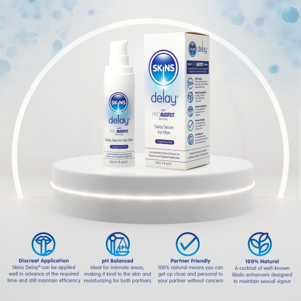 Ο Φυσικός Ορός Καθυστέρησης για Άνδρες Skins προσφέρει μεγαλύτερο έλεγχο της σεξουαλικής αντοχής με φυσική φόρμουλα PROBOOST για στοχευμένη και διακριτική εφαρμογή. Ο Skins Delay Natural Serum είναι ένας φυσικός ορός καθυστέρησης σε μορφή τζελ σχεδιασμένος για να μειώνει απαλά την ευαισθησία και να βοηθά τους άνδρες να διατηρούν τη σεξουαλική τους σφριγηλότητα. Η μοναδική φόρμουλα PROBOOST περιλαμβάνει ενεργά συστατικά όπως L’Arginine Panax Ginseng Gingko Biloba Maca Root Saw Palmetto και Catuaba Bark προσφέροντας φυσική υποστήριξη στην αντοχή και τη διάρκεια της επαφής.