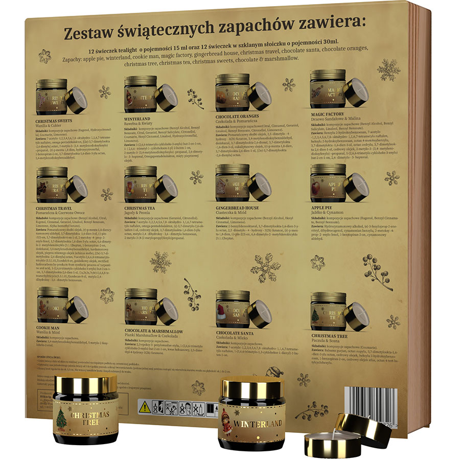 Μέσα στο εντυπωσιακό “βιβλίο” θα ανακαλύψετε 24 αρωματικά κεριά σόγιας – 12 ρεσώ και 12 μικρά κεριά σε γυάλινα βάζα των 30 ml – το καθένα με ένα ξεχωριστό άρωμα που θα γεμίσει τον χώρο σας με θαλπωρή και γιορτινή διάθεση.