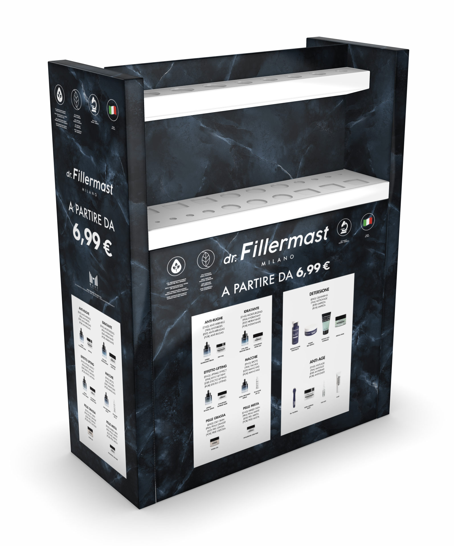 Η Dr. Fillermast είναι μια ιταλική σειρά δερμοκαλλυντικών αποκλειστικά για φαρμακεια, σχεδιασμένη για ολοκληρωμένη φροντίδα της επιδερμίδας με έμφαση στην ενυδάτωση, την αντιγήρανση και τη βελτίωση της υφής του δέρματος. Η σειρά περιλαμβάνει κρέμες, ορούς, gels, προϊόντα καθαρισμού και εξειδικευμένες λύσεις περιποίησης, κατάλληλες για καθημερινή χρήση. Όλα τα προϊόντα είναι δερματολογικά ελεγμένα, κατάλληλα για ευαίσθητες επιδερμίδες και βασίζονται σε δραστικά συστατικά υψηλής απόδοσης, όπως υαλουρονικό οξύ, πεπτίδια και σύγχρονα ενεργά μόρια.