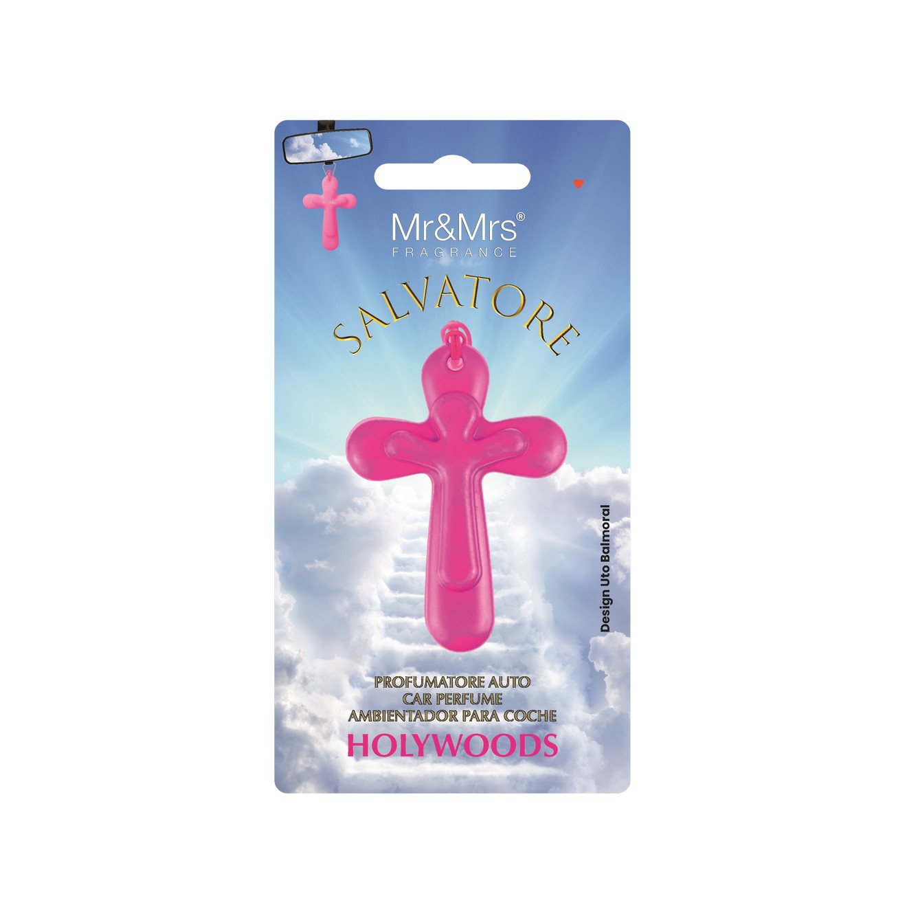 Ο Salvatore είναι το πρώτο και μοναδικό αρωματικό αυτοκινήτου σε σχήμα Pop σταυρού. Κρεμασμένο στον καθρέφτη σας, θα προσφέρει ένα παραδεισένιο άρωμα στο εσωτερικό του αυτοκινήτου σας Σχεδιασμένο από τον Uto Balmoral και κατασκευασμένο στην Ιταλία από EVA μη τοξικό καουτσούκ, η σύνθεσή του είναι χωρίς αλκοόλ και έχει εξαιρετικά δυνατό και μακράς διαρκείας άρωμα. Στο πίσω μέρος του προϊόντος υπάρχει το μήνυμα «God Love». Νότες κορυφής: Βατόμουρο, Τζίντζερ, Κάρδαμο. Καρδιά: Γιασεμί, Ξύλο Κέδρου, Κυπαρίσσι, Σημύδα. Βάση: Βέτιβερ, Κασμίρι, σανδαλόξυλο, Μόσχος. Το άρωμα διαρκεί περίπου 30 ημέρες.